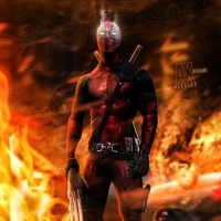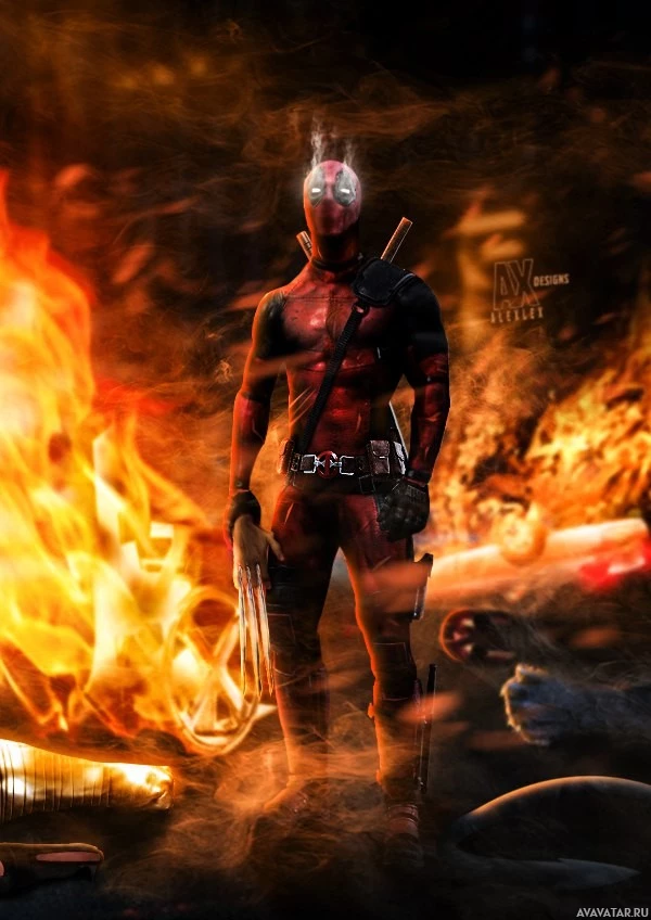 The image features the character Deadpool, also known as Wade Wilson, standing in front of