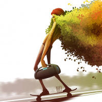 long arm that extends outward as if in motion while skateboarding. There are leaves scattered around the character, suggesting a connection with nature or possibly a theme of growth or transformation. The artwork conveys a sense of movement and energy through the dynamic poses and