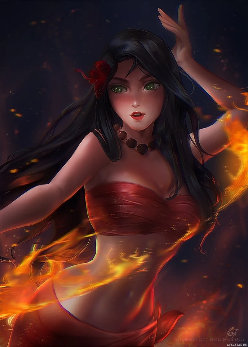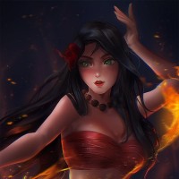 dark hair and is wearing a red garment that suggests she may be a warrior or a character related to fire or heat based on the flame elements around her. Her pose is dynamic with one hand outstretched as if casting or controlling the flames around her. The character's expression conveys focus or concentration, and the overall impression is that of