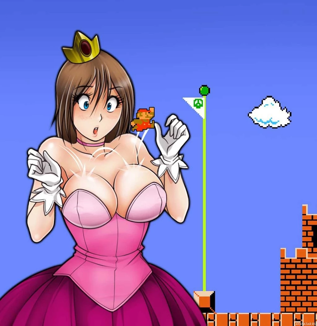 a video game, specifically one that resembles Super Mario Bros., as indicated by the presence of what appears to be a flagpole and a coin block above it. The character is dressed in her iconic