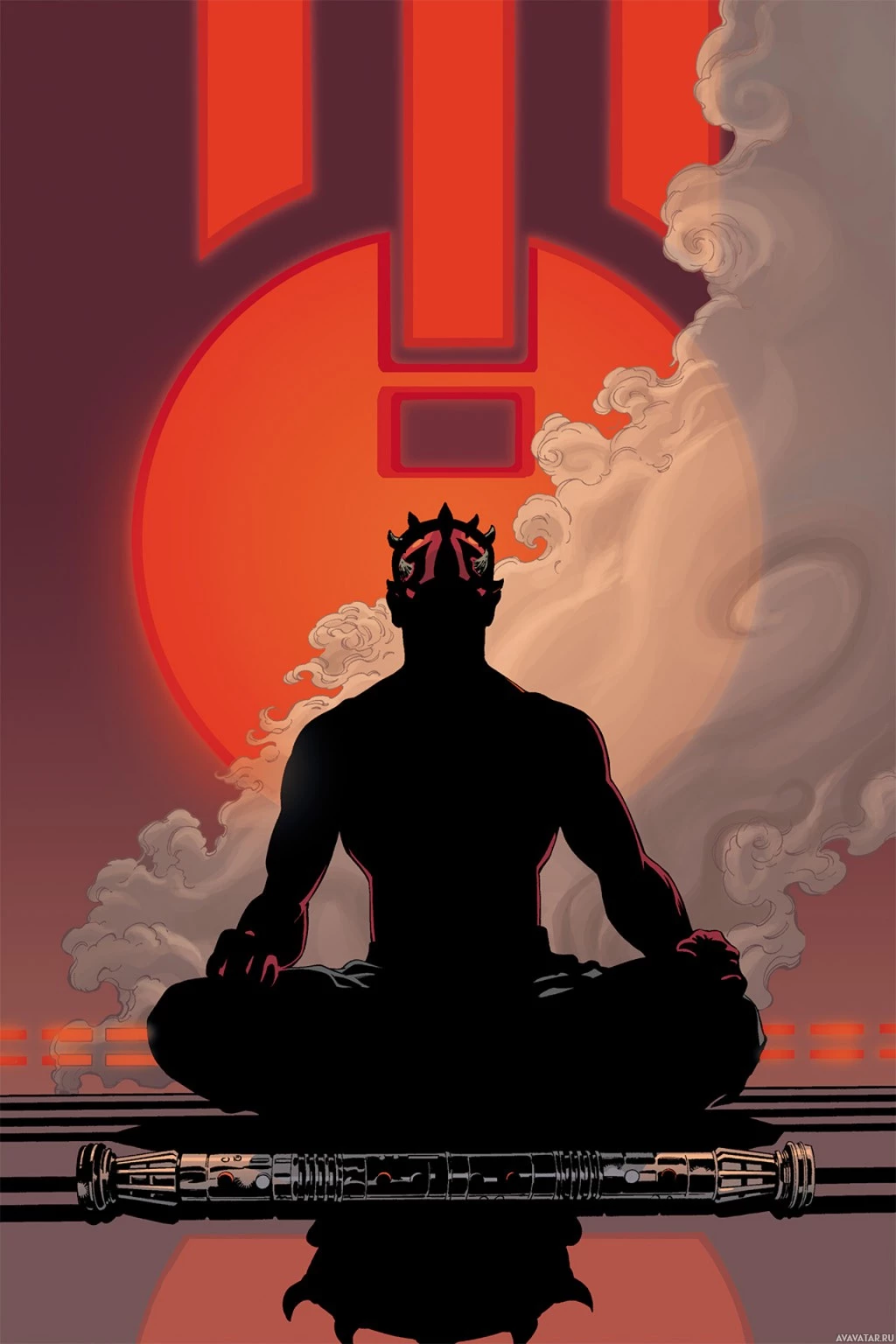 Darth Maul, a Sith Lord known from the "Star Wars" franchise. He is depicted sitting in meditation pose, which might suggest