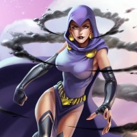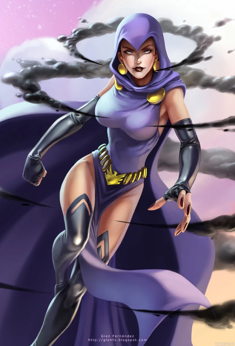 iconic costume which features a purple and black outfit with a hood that conceals her identity. The character is drawn in