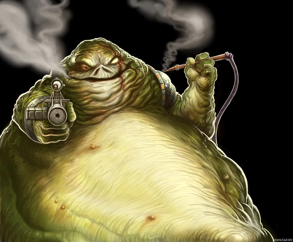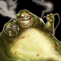the Star Wars franchise. He is shown in a humorous or satirical context, as he appears to be smoking and holding a gun in one hand while his other hand has a canister of what looks like smoke or gas attached to it. The overall style suggests that this might be