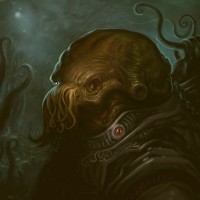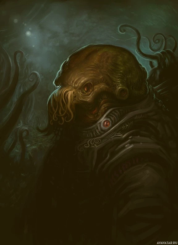 a humanoid form, which is reminiscent of the Cthulhu Mythos, often associated with the works of H.P. Lovecraft. The background is dark and mysterious, filled with silhouettes of other creatures that contribute to the eerie and fantastical atmosphere of the image.