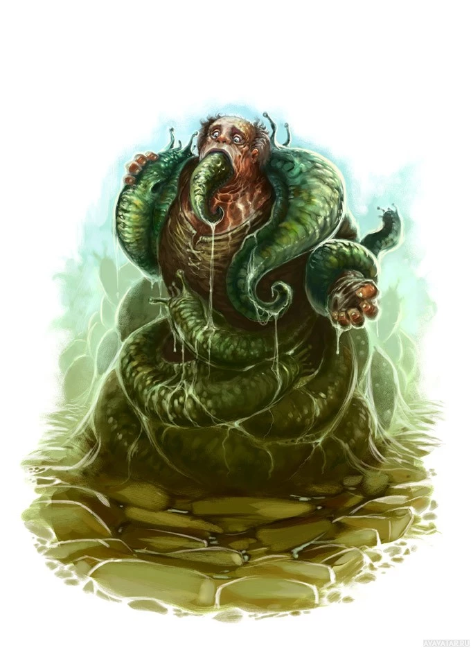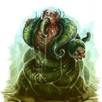 the body of a human, but with snake-like characteristics such as scales and a long tongue. The creature is slithering on what looks like stone ground or