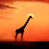 The image features a silhouette of a giraffe standing alone during sunset. The sky is painted in shades of orange and red, indicative of a dramatic sunset or sunrise. The giraffe is facing the setting sun, and its long neck and legs are prominent against the colorful backdrop. This scene evokes a sense of tranquility and natural beauty.