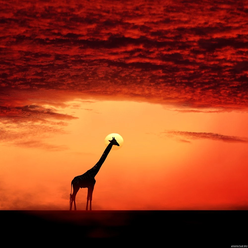 На картинке изображен силуэт жирафа, стоящего в одиночестве во время заката. Небо окрашено в оттенки оранжевого и красного, что указывает на драматический закат или восход солнца. Жираф обращен лицом к заходящему солнцу, а его длинная шея и ноги видны на красочном фоне. Эта сцена вызывает чувство спокойствия и природной красоты.