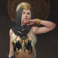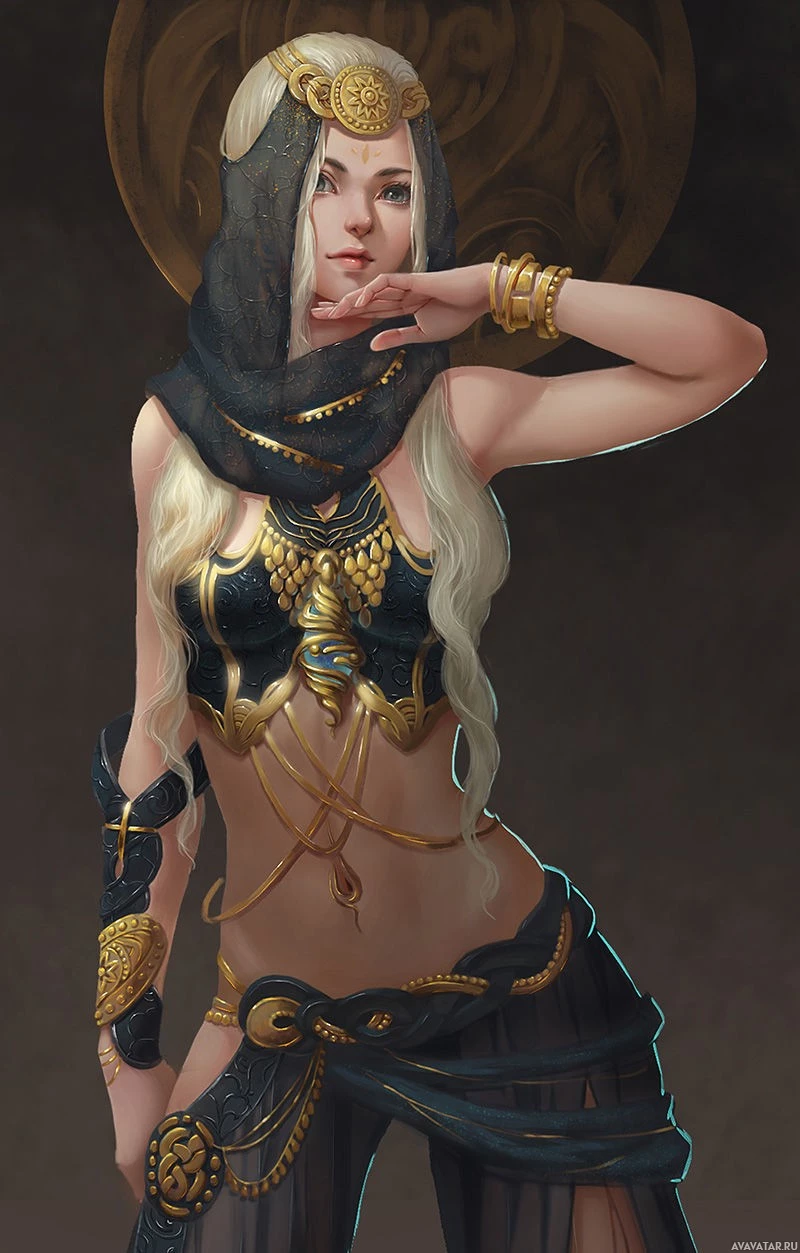 golden accents. Her expression seems contemplative or thoughtful, and she is resting one hand on her chin while the other arm is extended slightly away from her body. The background suggests