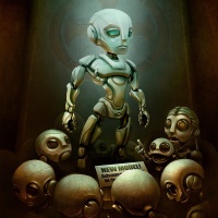 artificial intelligence. There's a symbol or emblem in the upper right corner that resembles a shield with a gear inside it, which could be indicative of some sort of branding or logo related to the robots or their creators. The overall atmosphere is somewhat solemn yet intriguing, hinting at the idea of