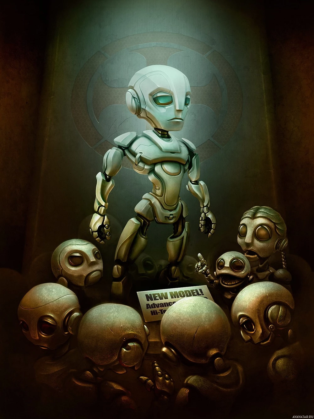 various expressions and designs on them. The background suggests an industrial or lab-like setting, reinforcing the theme of technology and
