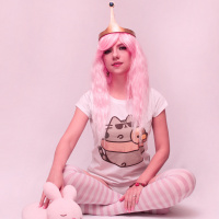 Princess Bubblegum's appearance. The individual is also holding a plush toy that looks like Marceline