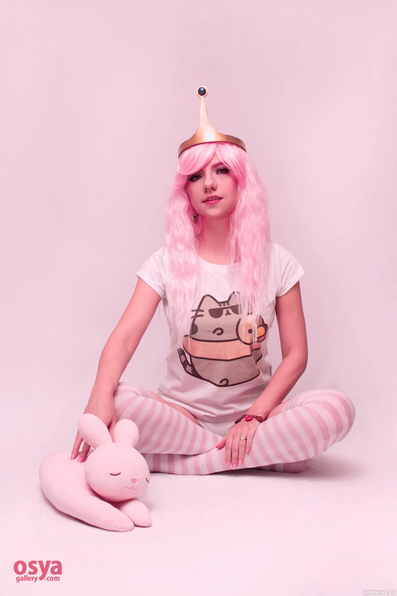 The image features a person sitting on the floor, dressed in a costume that resembles Princess Bubblegum from
