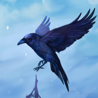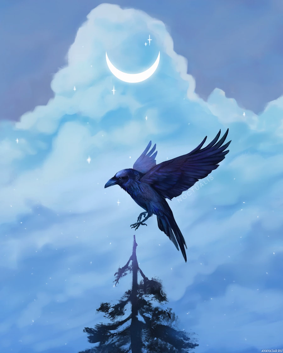 a backdrop of clouds and a partial view of the moon. The crow is depicted with its wings spread wide, giving