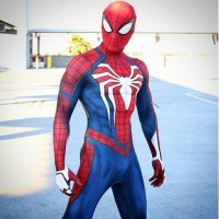comic books published by Marvel Comics. The costume features the iconic blue and red bodysuit with the spider