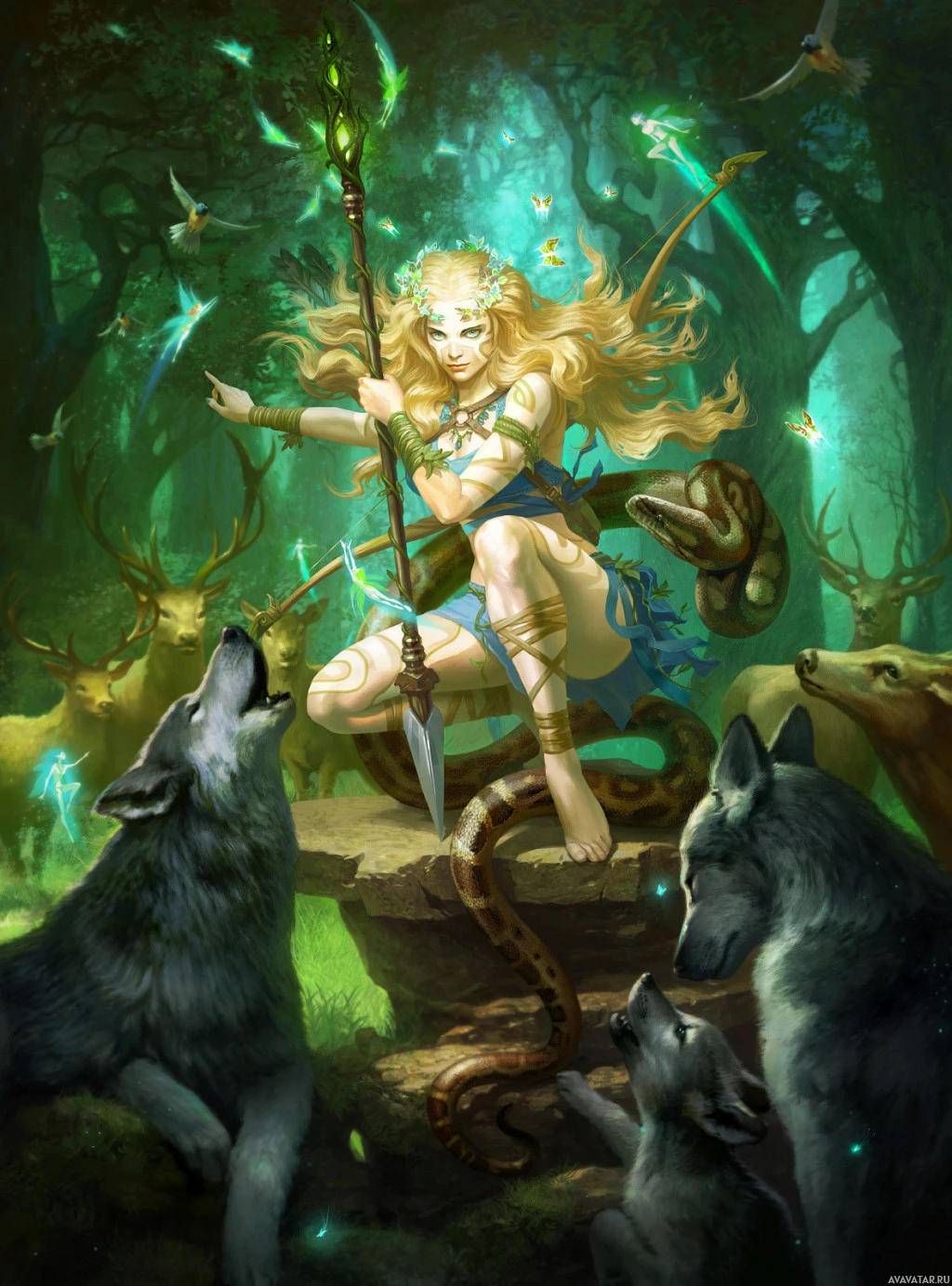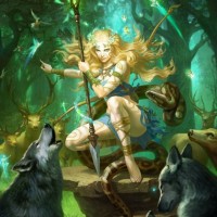 a blonde girl with wings, sitting on a rock and holding a bow. She is surrounded by wolves and other