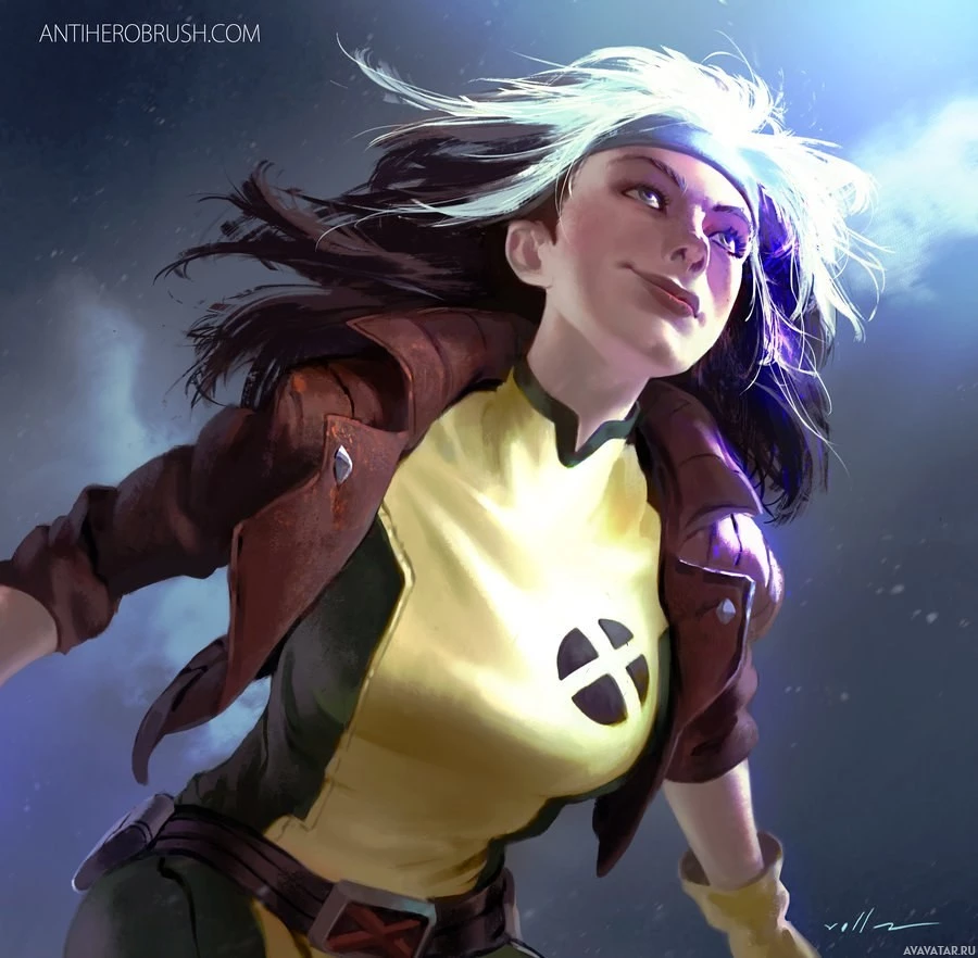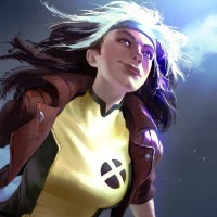 illustrated character who appears to be Rogue from the X-Men comics. She is depicted in mid-motion with her hair flowing behind her and is wearing her classic brown