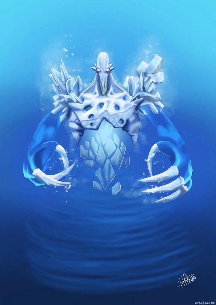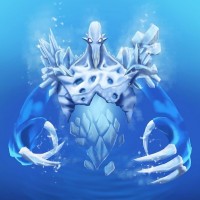 a humanoid form but also includes aquatic elements like tentacles and what seems to be a shell or armor made of ice or crystal. The background is a deep