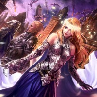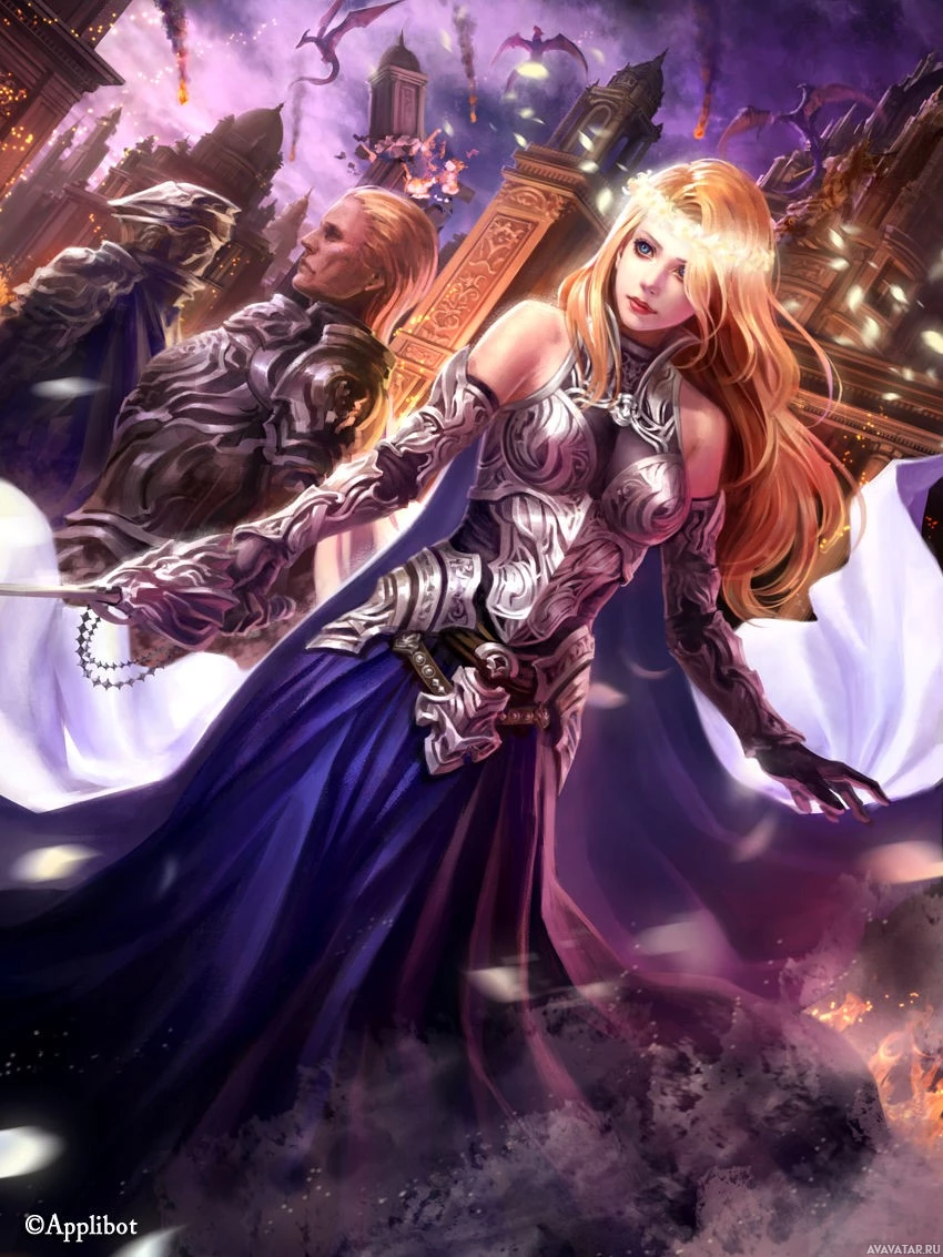 blonde hair and is wearing a helmet with a crest, suggesting she might be in armor or participating in battle. The background suggests