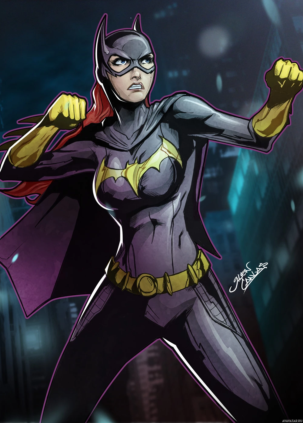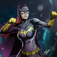 The image features an illustration of Batgirl, a fictional superheroine from the DC