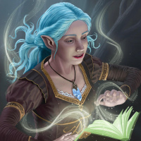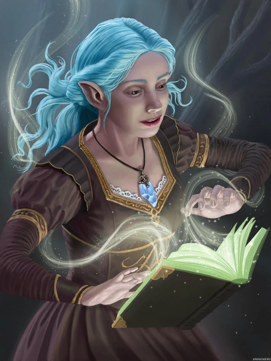 blue hair and pointed ears. She is wearing what seems to be a medieval-style dress or gown, which includes a necklace around her neck. The character is holding an open book in both hands, with a small amount of