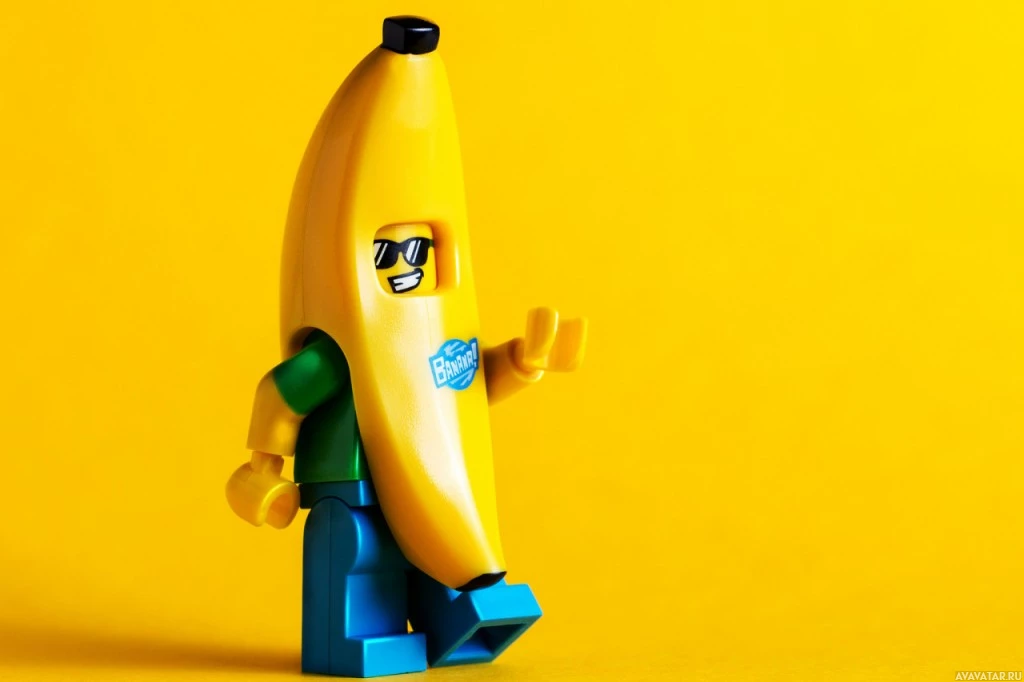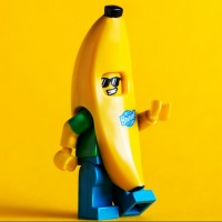 a Lego figure designed to resemble a banana with human-like characteristics. It is standing upright on