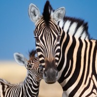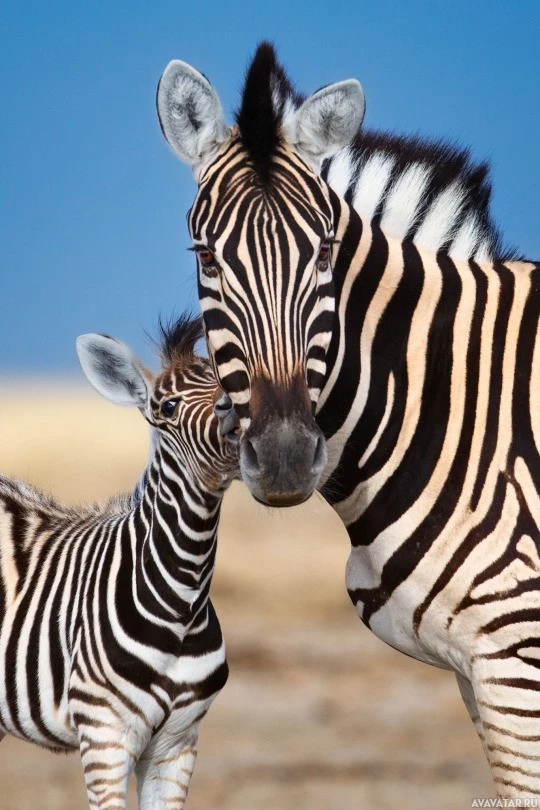 The image shows a mother zebra and her young, standing in what appears to be a dry