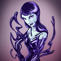 purple hair and is wearing a black outfit with intricate designs resembling dark smoke or shadow-like patterns on her skin. She has a somewhat menacing or mischievous expression, which aligns with the character's often devious nature within the comic series. The artwork style is reminiscent of