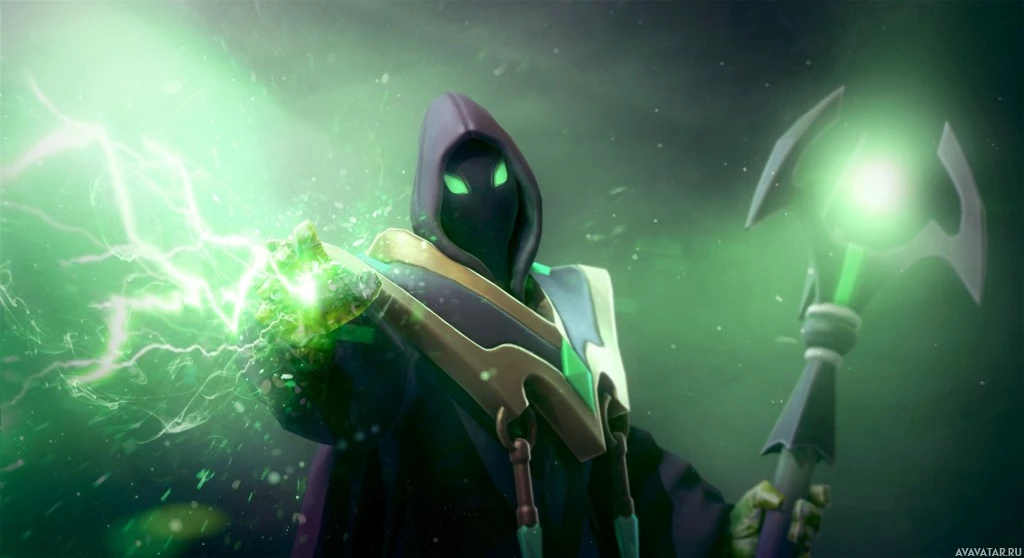 hooded cloak and the staff he holds with both hands, which appears to be emitting electricity or energy. The background has a dark,