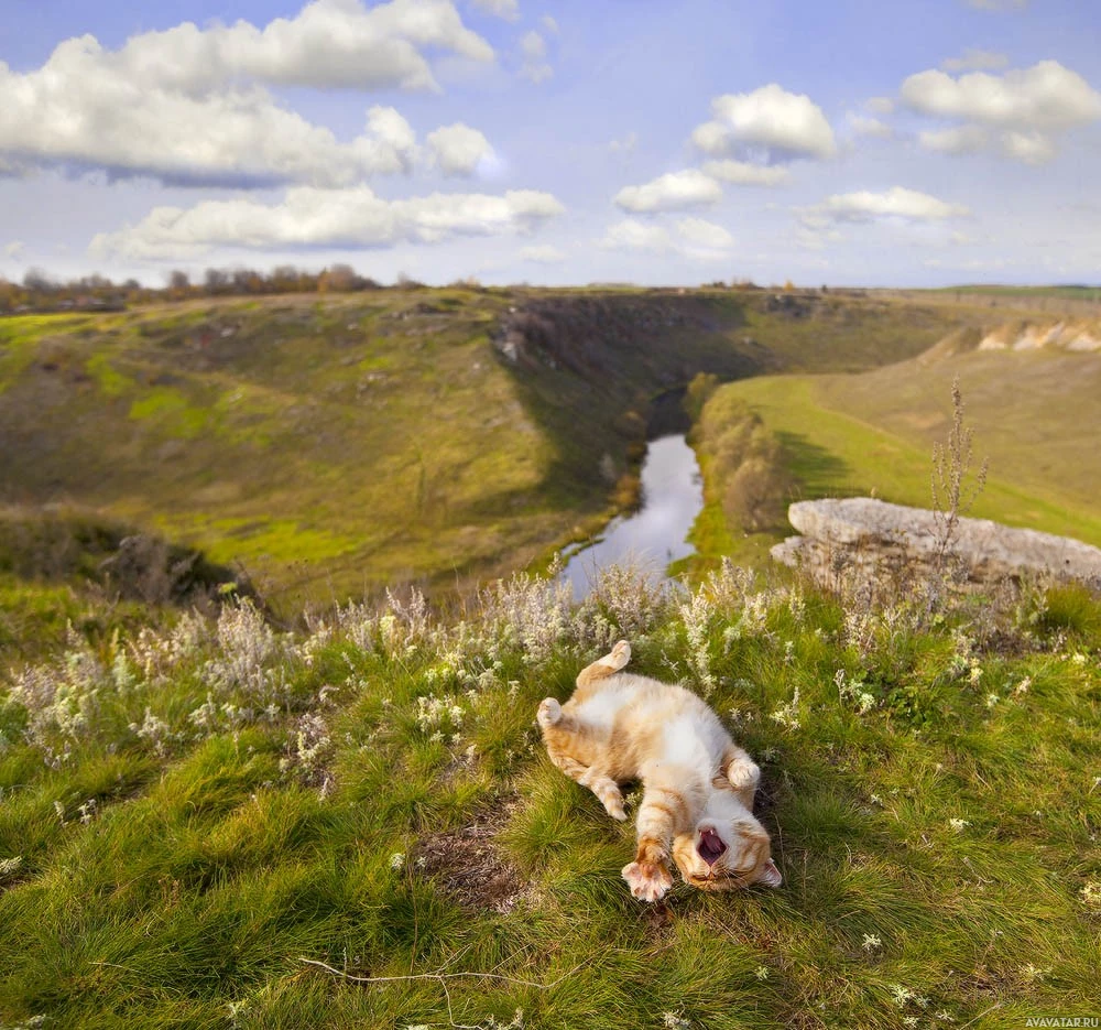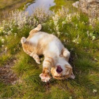clouds in the sky. On the left side of the image, there is an animal lying on its back with all four paws in the air, which appears to be a dog rolling around joyfully on a grass-