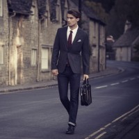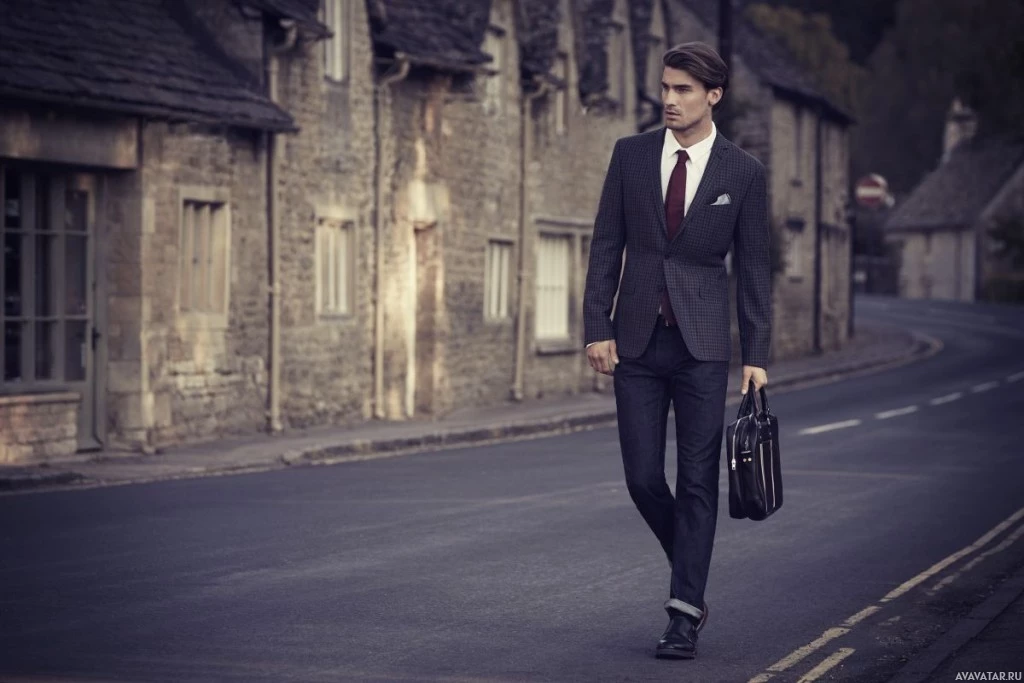 a gray suit and tie, along with dress shoes. He also has a bag slung over his shoulder. The setting suggests a residential or historical neighborhood, possibly in the UK given the style of the houses.