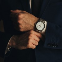 dark hair and is looking directly at the camera. On his left wrist, he's wearing a watch. There's no clock visible in the image. The man exudes a professional and confident demeanor.