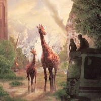 signs of destruction and nature taking over the urban areas. The sky suggests it could be either dawn or dusk, given