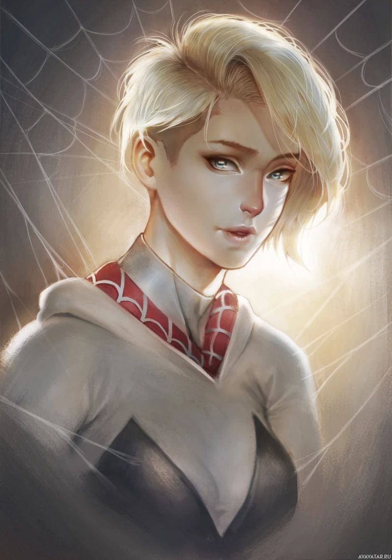 blonde hair and a red and white outfit that resembles Spider-Man's suit. She has