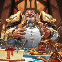 The image depicts a cartoon-style character, which appears to be a fantasy or gaming-themed illustration. This character is seated at a table with an array of