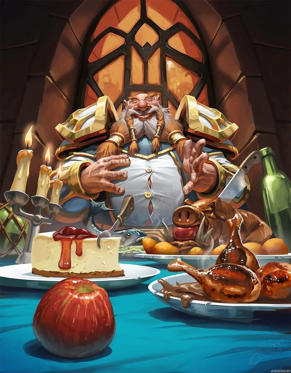 food items such as cake, pie, bread, and various fruits like apples and oranges. In front of the character are multiple plates and utensils, including knives and spoons. The setting suggests a feast or a hearty meal in a warmly