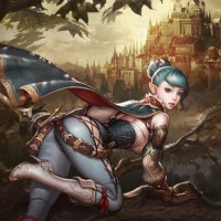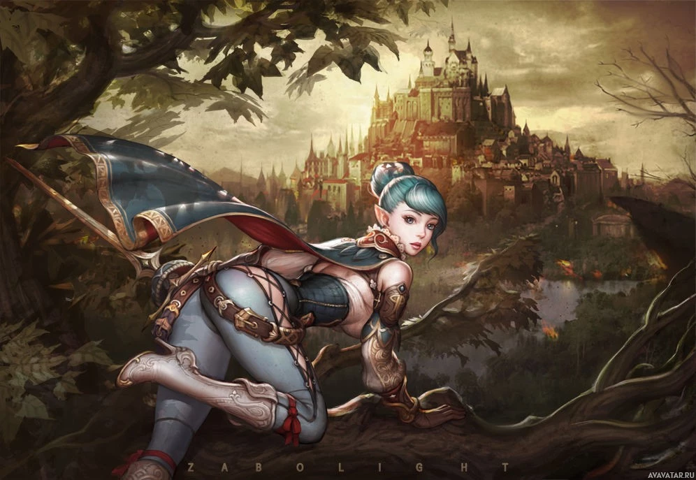 the fantasy genre, specifically an elf with turquoise hair. She is shown from behind, suggesting she might be on a mission or in a stealthy situation, typical of many
