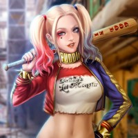 blonde hair, and prominent makeup. The text "Harley Quinn" suggests that this is indeed the depiction of that character.