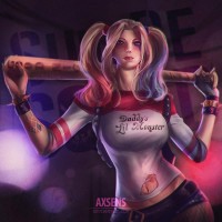 Harley Quinn, a well-known character from the DC Comics universe. She is holding a baseball bat and has her signature hairstyle with