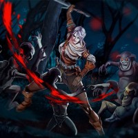 human figures in the background who appear to be attacking her. The setting is a dark forest at night, with