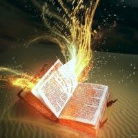 an open book with glowing text, which suggests that the words within the pages have a mystical or enchanting power. From the book, there seems to be a flow of