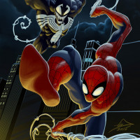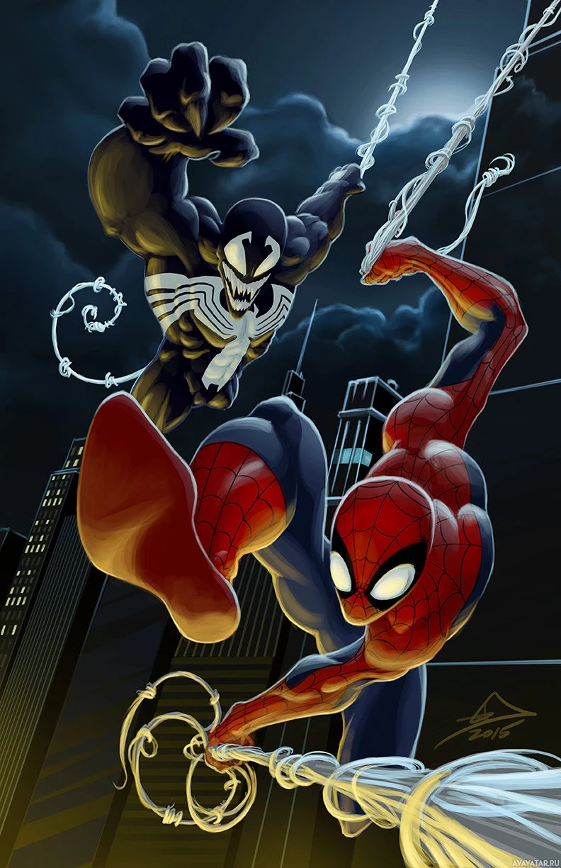 a dark suit with a symbiote design on the chest and back, which represents Venom. Both characters are swinging their web-shooters and appear to be in motion against a nighttime