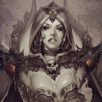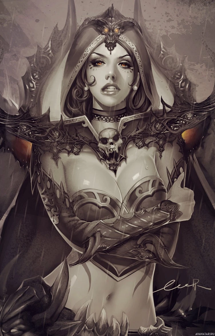 intricate designs on it. Her attire has a gothic or dark fantasy style, with elements like spikes and skulls. The character is depicted in a dynamic pose, as if she is ready for combat, which suggests that the image may be related to