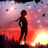 a silhouette of a girl standing against the backdrop of a forest at what appears to be sunset or dawn. There are warm, orange and pink hues in the sky, suggesting a serene and perhaps magical atmosphere. The girl is looking towards an object that resembles