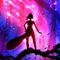 The image depicts a silhouette of a girl standing in the middle of a vibrant, magical forest. The colors are predominantly blue and pink with some sparkling effects that create an enchanting atmosphere. It's not clear what she is doing specifically, but her pose suggests she might be observing something or perhaps engaging with the magical environment around her.