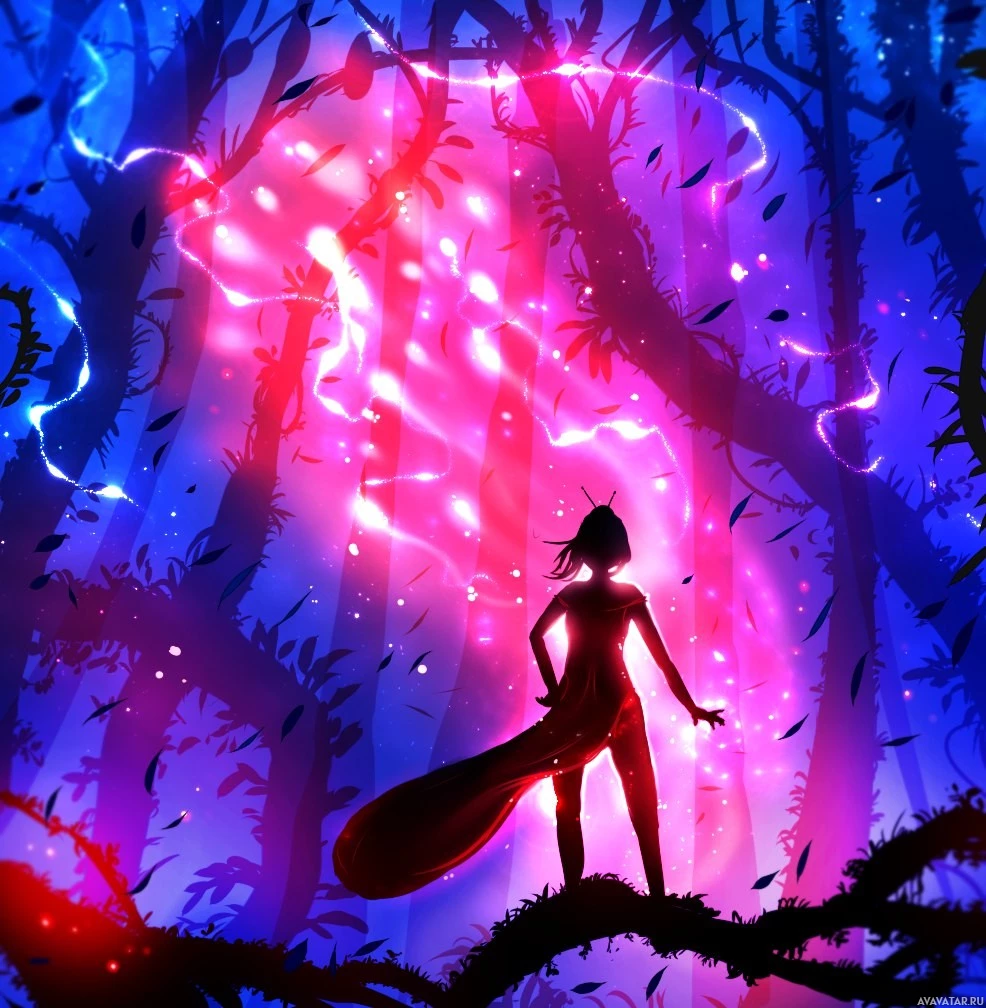 На картинке изображен силуэт девушки, стоящей посреди яркого, волшебного леса. Цвета преимущественно синие и розовые с некоторыми сверкающими эффектами, которые создают очаровательную атмосферу. Неясно, что она делает конкретно, но ее поза предполагает, что она может наблюдать что-то или, возможно, взаимодействовать с магической средой вокруг нее.