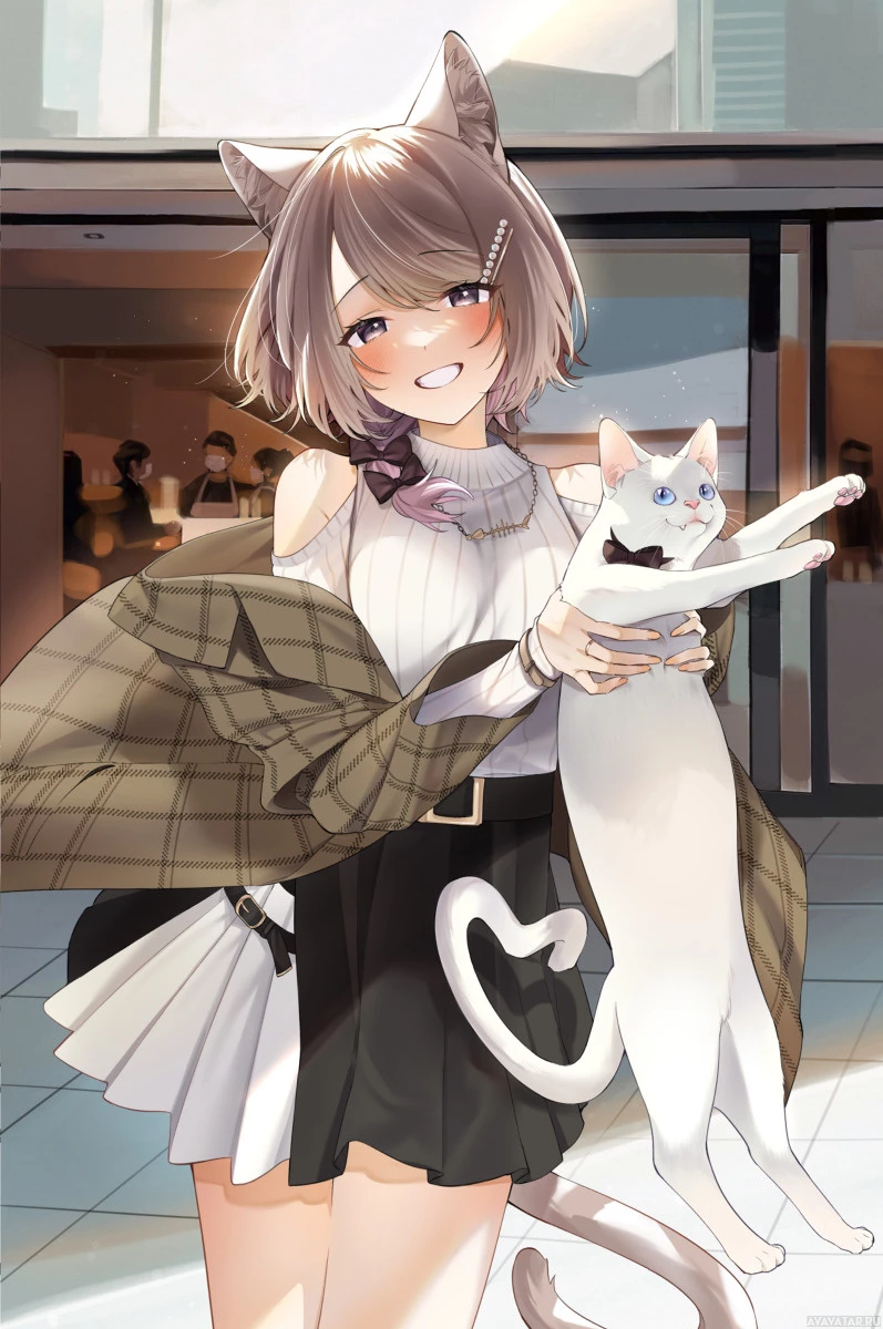female character who appears to be a young girl. She is holding a cat in her arms, and the cat seems to be comfortably resting on her. The girl is wearing a white blouse with a pearl necklace and has