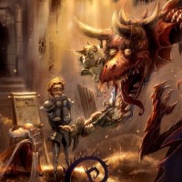 open mouth. It is holding onto the arm of a figure that looks like it might be an adventurer or warrior, dressed in armor. In the background, there's