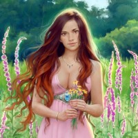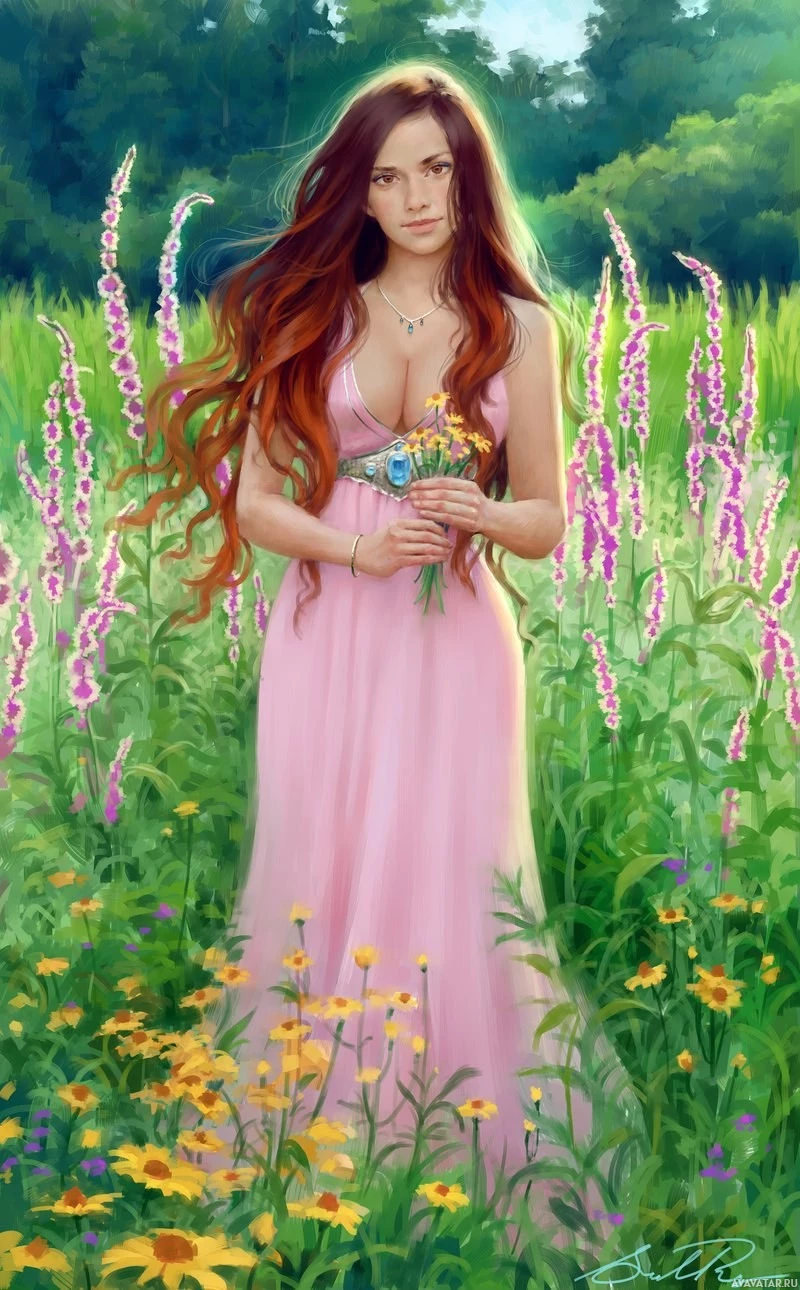 pink dress and holding a small bouquet of flowers. Her expression is serene as she gazes into the distance, possibly lost in thought or enjoying the tranquility of her surroundings. The field appears to be abundant with wildflowers, suggesting it might be springtime. The scene conveys a sense of peace and