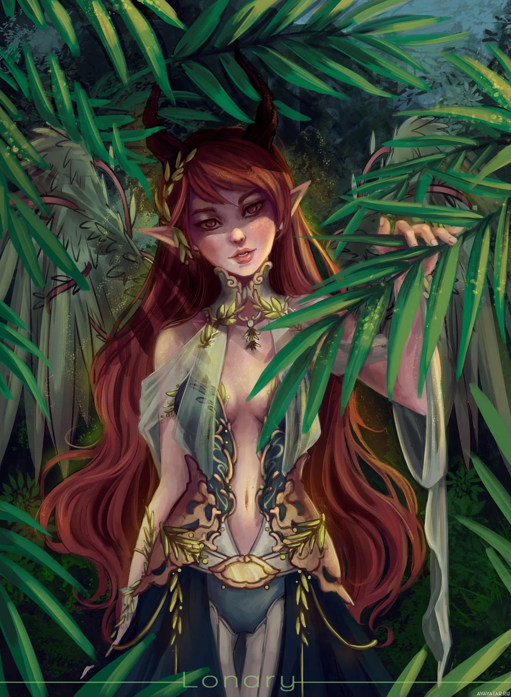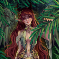 red hair and horns, which are often associated with fictional depictions of devils or demons in various mythologies. The character is set against a backdrop that seems to be a lush forest, with