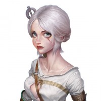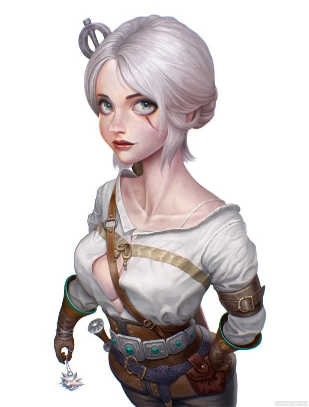 armor pieces on her shoulders and waist, which is typical of Ciri's outfit in the game when she is in combat-ready gear.